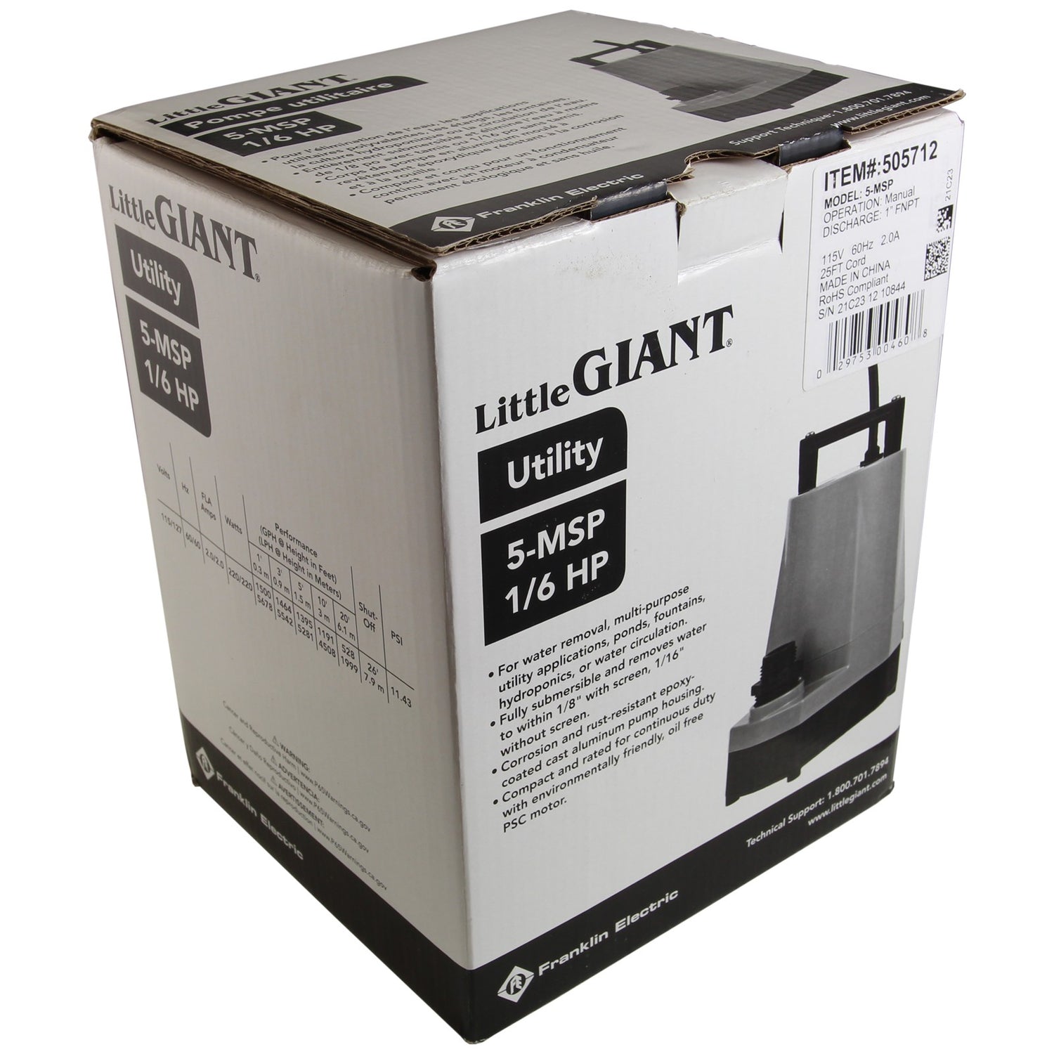 Pump, Submersible, Little Giant 5-MSP, 1/6hp, 115V, 25ft : 505712 is backordered and will ship as soon as it is back in stock.