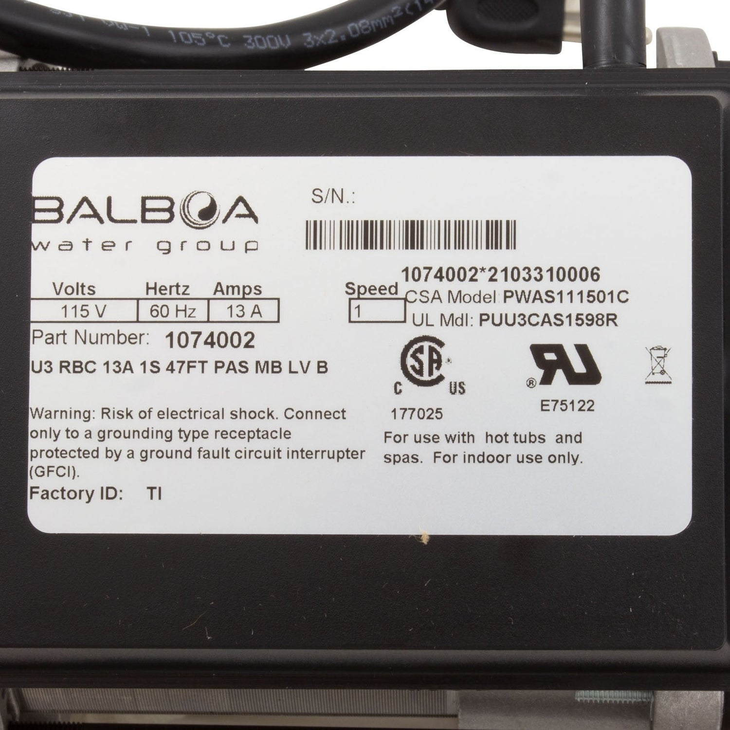 Pump, Bath, BWG Vico WOW, 1.5hp, 115v, w/Air Switch & Cord, OEM : 1074002