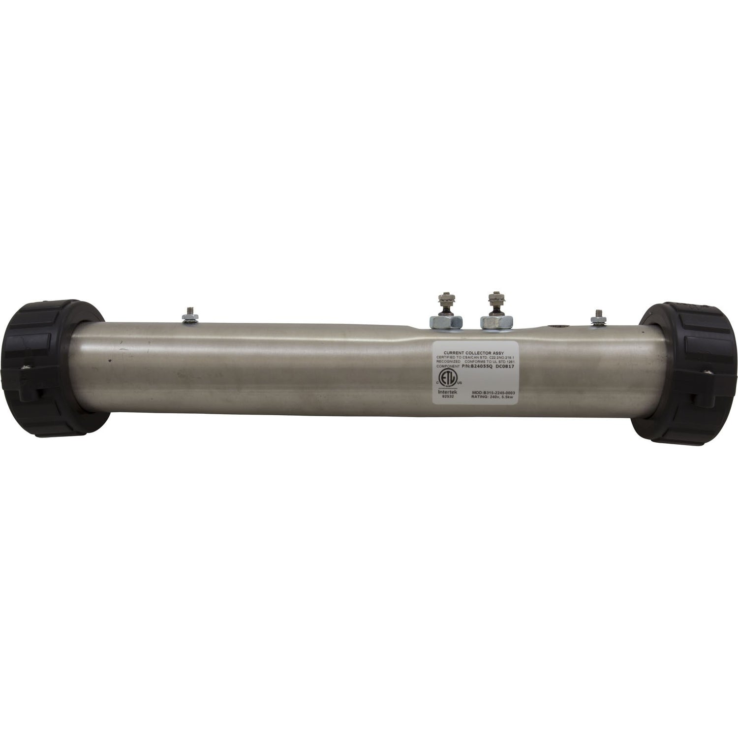 Heater, FloThru, Sundance/Spa Bldrs, 15" x 2", 230v, 5.5kW Flow Thru Heater Assembly used in Sundance Spas, Spa Builders and Pinnacle Spa Controls Stainless steel 2-1/4" x 15" with 5.5kW/230v, 1/8"npt pressure switch tap, (2) 10-32 x 3/8" mounting stud. Tailpieces and gaskets sold separately. Pressure switch not included Housing Configuration: Straight Heater Length: 15" Threaded Tap Orientation: 12 O`Clock Kilowatts: 1.375kW, 5.5kW Voltage: 115v, 230v Sensor Stud Orientation: 3 O`Clock Mounting Stud Type: FixedHeater Size: 2"Heater Application: Pinnacle, Spa Builders, Sundance Replaces 1-HA-B24055Q,2-00-0013,2-00-7003,20-00227,20-00228,20-00294,26-0056-7S-K,26-0056-7T-K,26-0456-K,26-0800-7S-K,403986,46-371-1214,48-3300-10-275H,48-3300-10-456H,530AA0107,6000-156,610473,611038,C2550-0056,C2550-0056A,C2550-0056ET,C2550-0456,C2550-0456ET,C2550-0803A