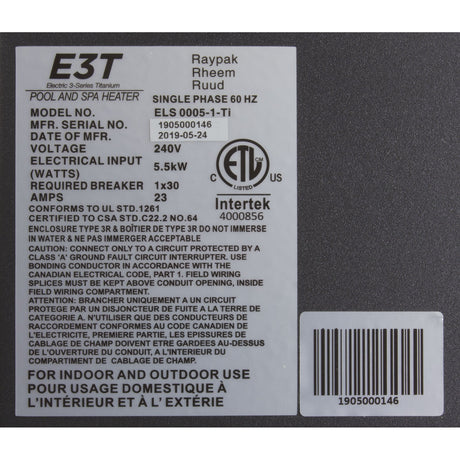 Digital Electric Heater, Raypak E3T, 1-1/2" mpt, 230v, 5.5kW : 017121