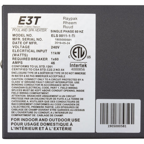 Digital Electric Heater, Raypak E3T, 1-1/2" mpt, 230v, 11kW : 017122