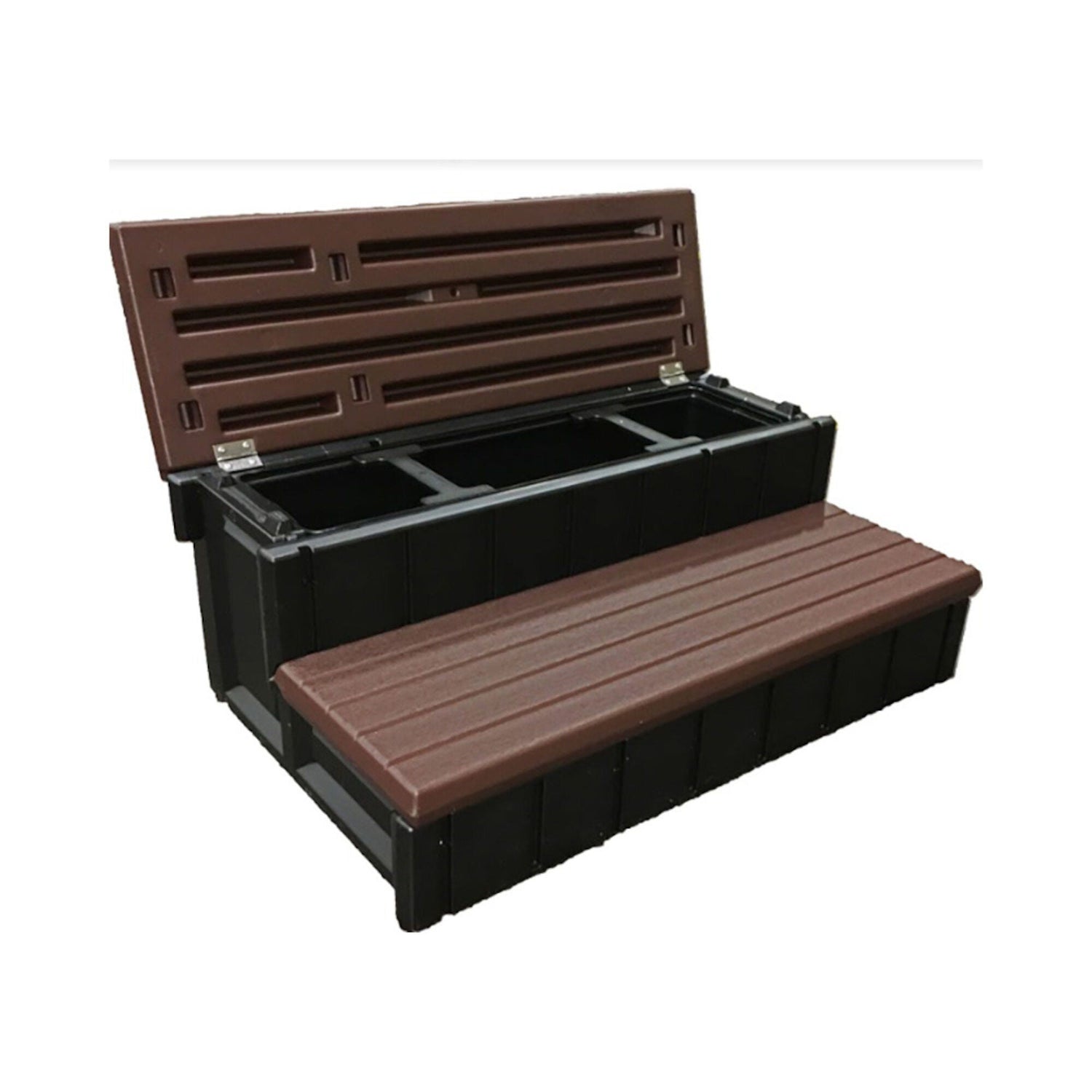 36″ Storage Step with flip top. The new storage step offers you the beauty and durability of the Leisure Accent line with the versatility of a storage container. Available in 5 rich colors that matches virtually any spa skirt. 36″ wide x 14″ high. Chose from from redwood, taupe, grey, portabello or espresso colors. Removable storage compartment for easy cleaning. Storage compartment dimensions (in inches): 30.75 Long x 8.25 Wide x 12.5 Deep.