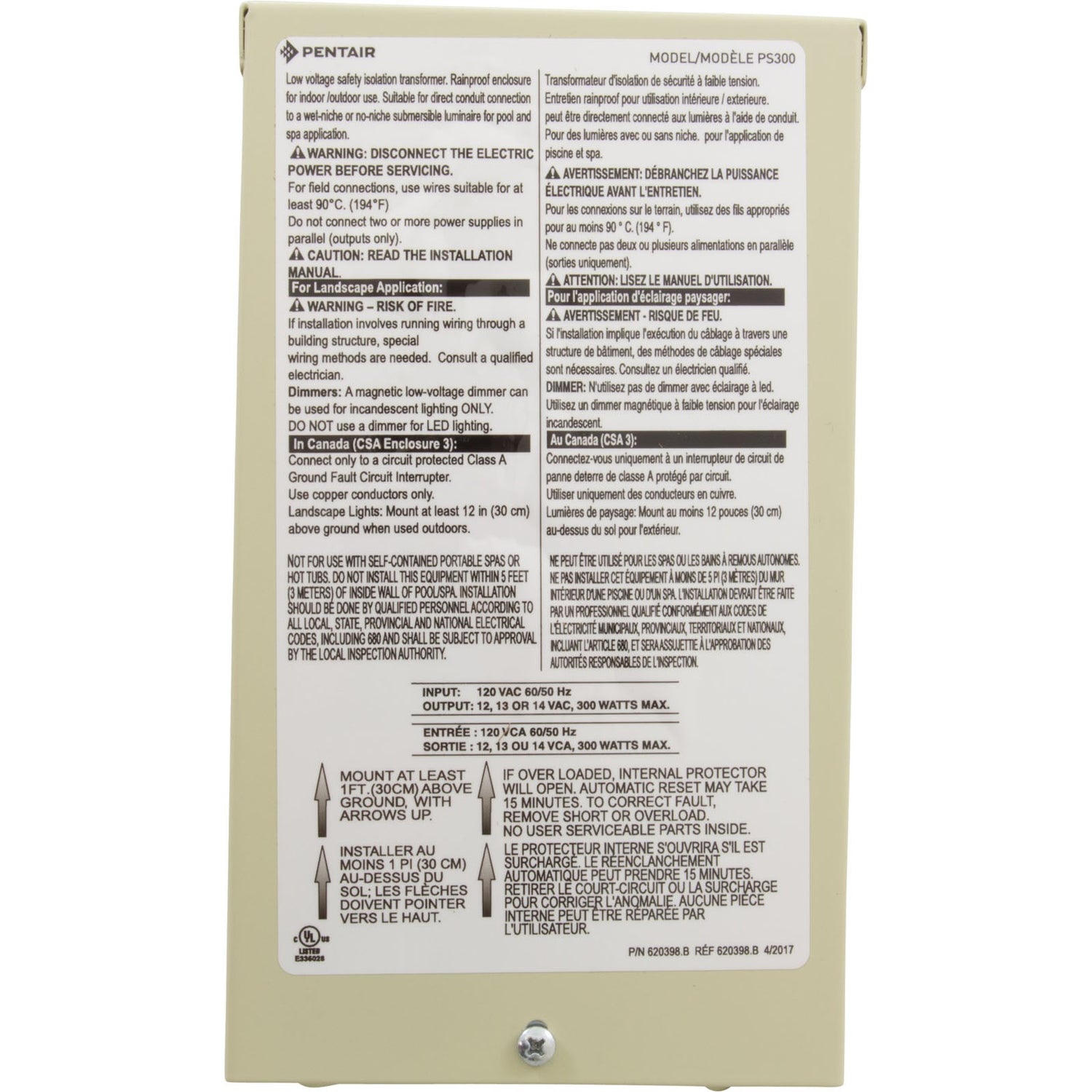 Transformer, Pentair, 12v to 14v, 300w : 619963