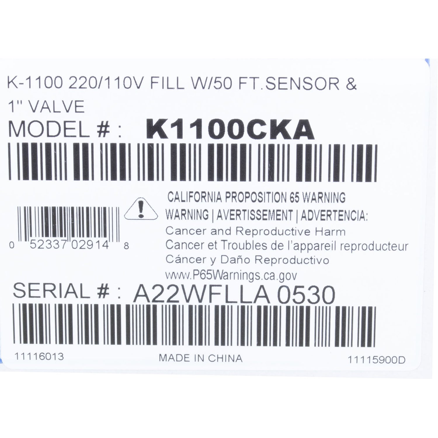 Auto Fill, Jandy Levolor K1100, Fill Only, 1", Dual Style, 50ft : K1100CKA